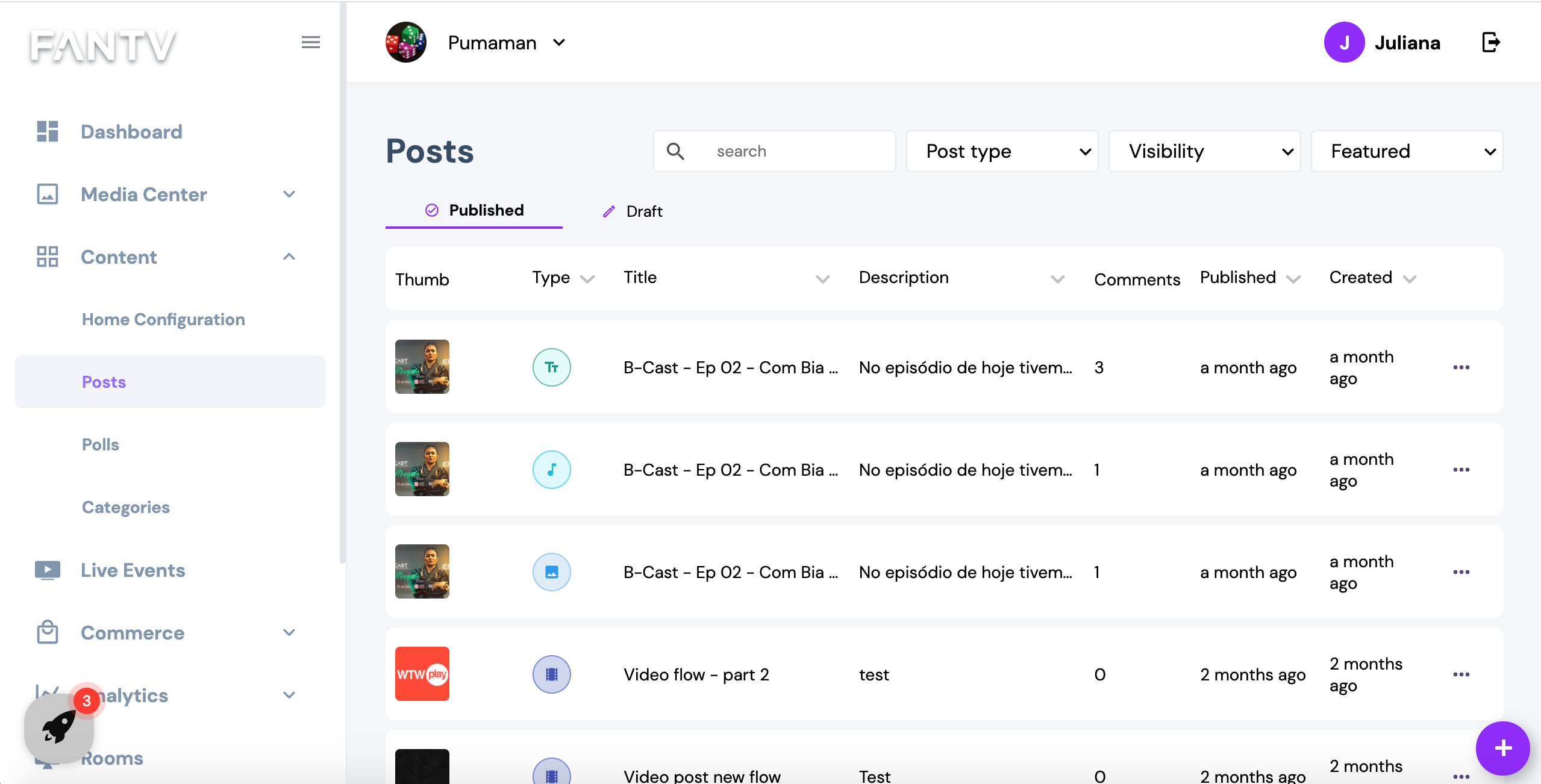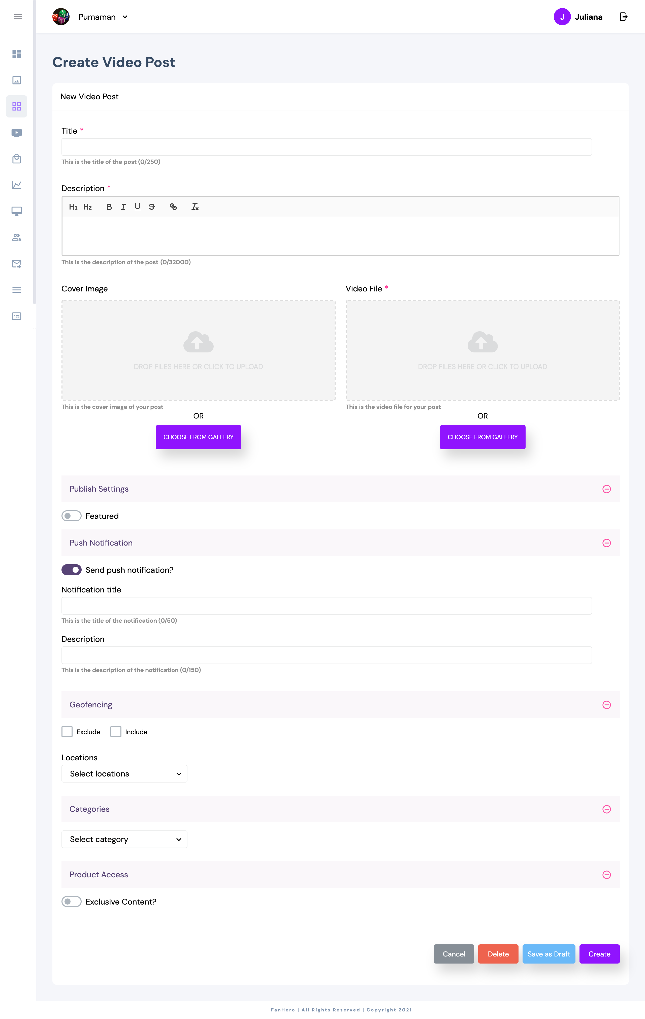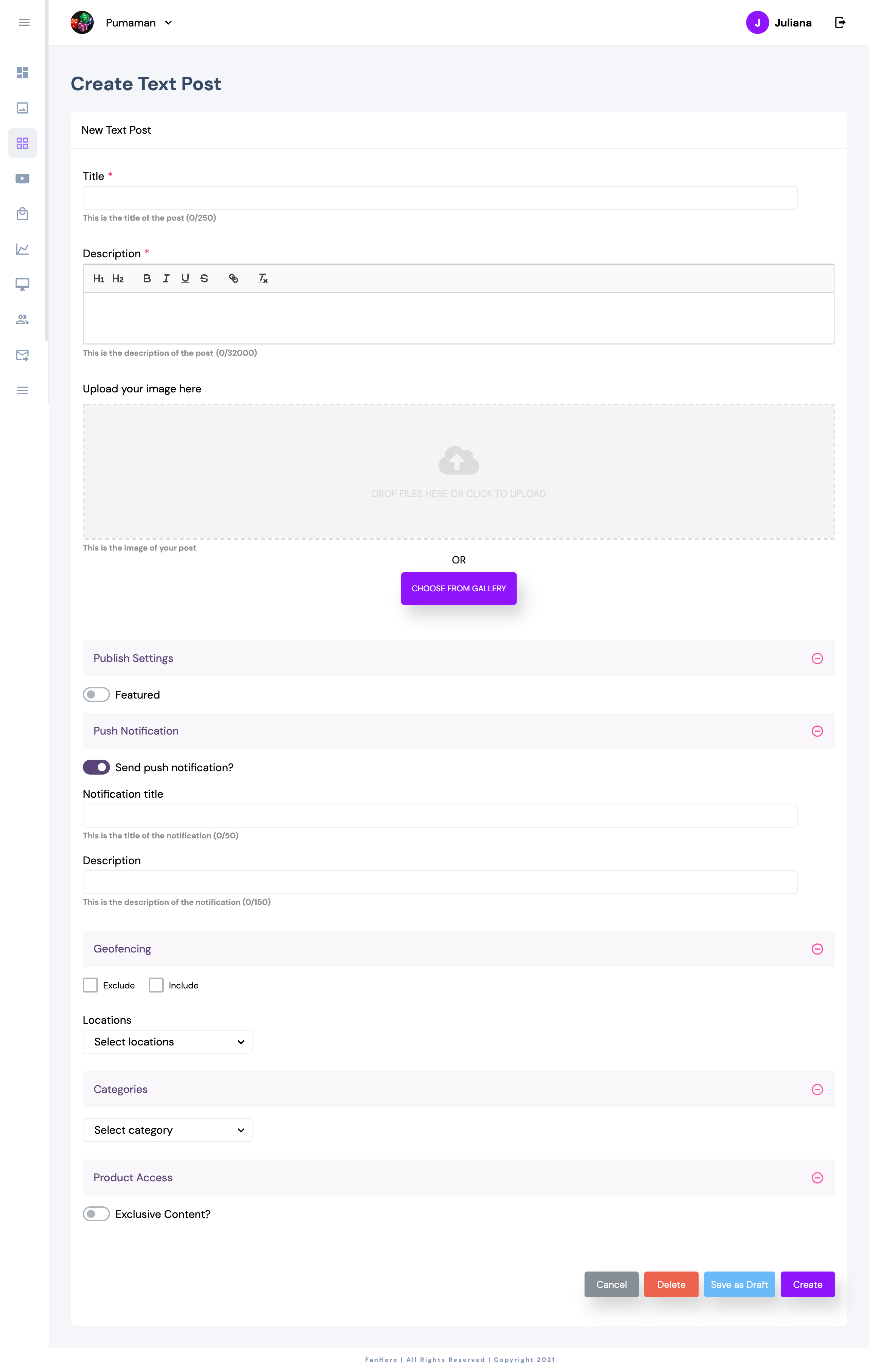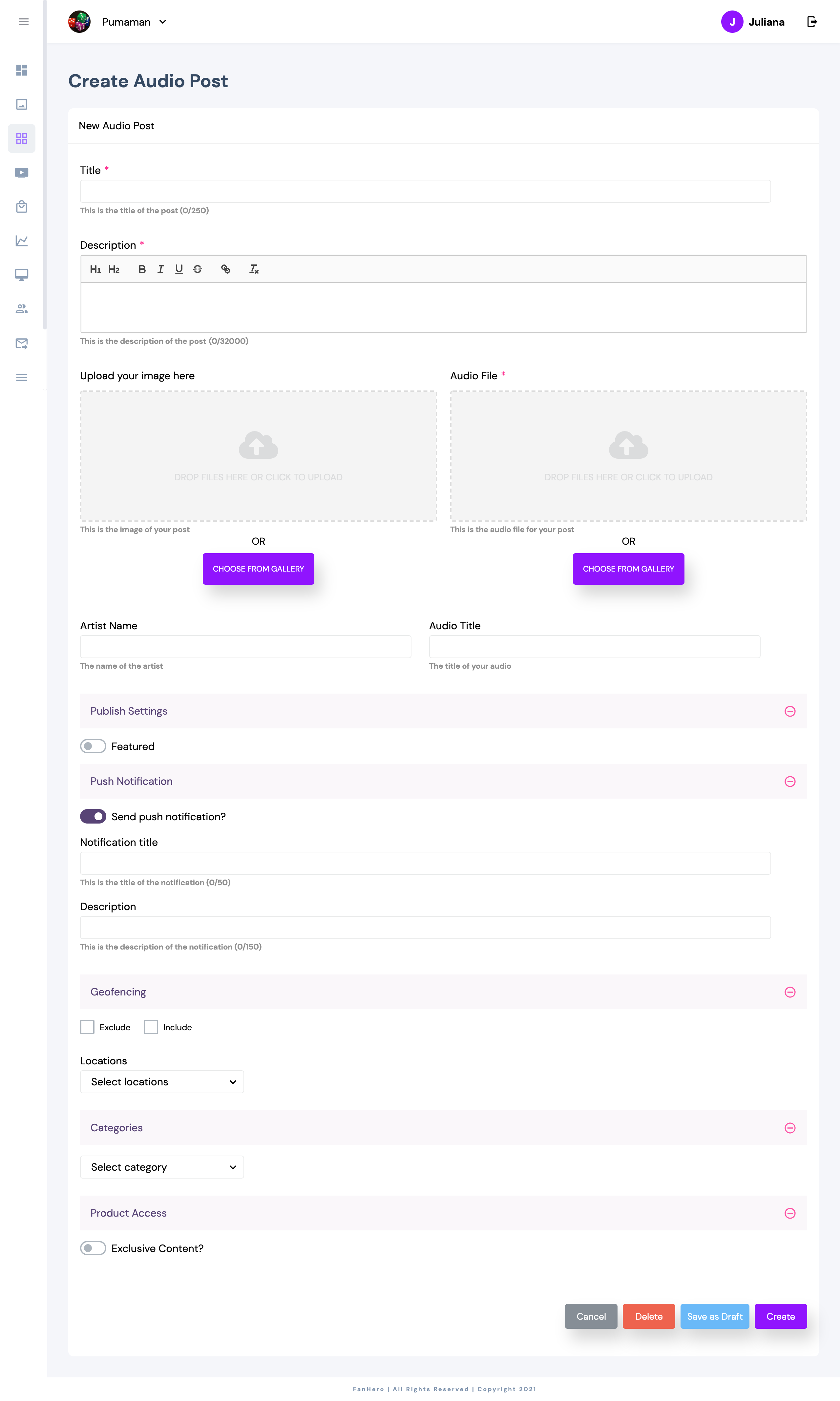 This is the section where Admin users can create photo, blog, video and audio posts that will be accessible in the app for End Users.